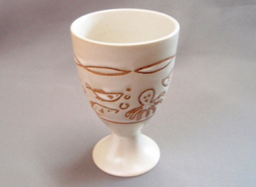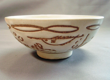 撥水剤に絵具を混ぜたものを、素焼きの生地に直接印刷加工し、その上に釉薬をかけると釉薬をはじきます。