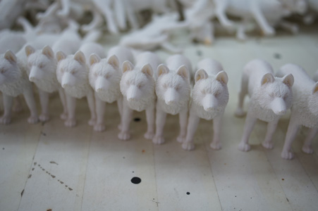 写真はポリストーン工場の製作現場です。 この素材はプラスチックと石の粉末を混ぜたものです。 彩色でかなり本物に近く出来るので博物館グッツやオブジェでの人気商品です。